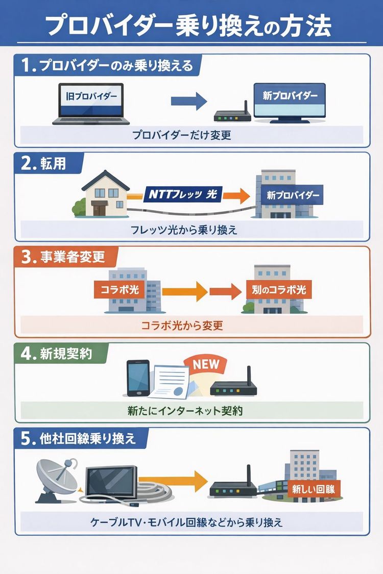 プロバイダー乗り換え方法は「回線を変えるかどうか」で大きく分かれます。