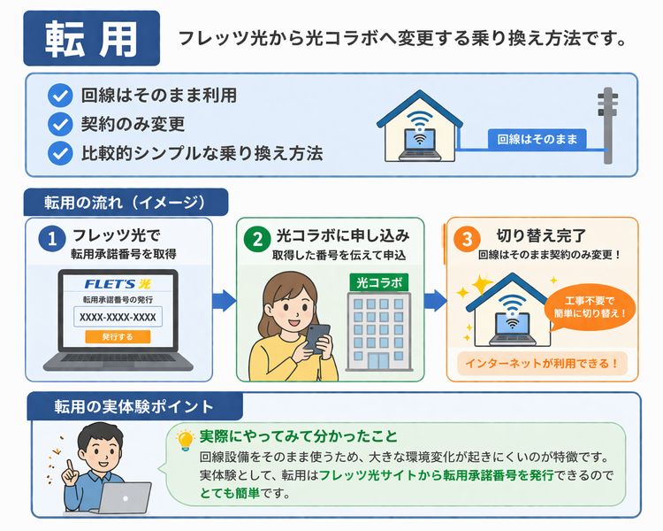 回線設備をそのまま使うため、大きな環境変化が起きにくいのが特徴です。実体験として、転用はフレッツ光サイトから転用承諾番号を発行できるのでとても簡単です。