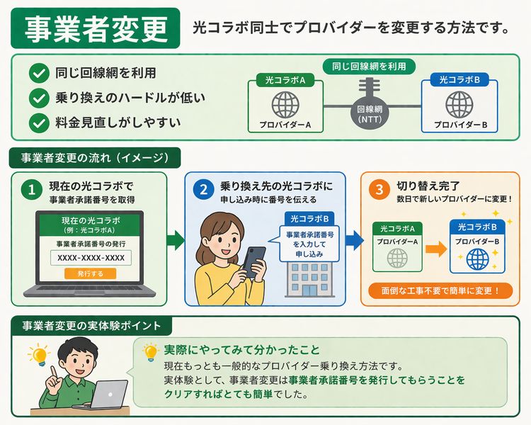 現在もっとも一般的なプロバイダー乗り換え方法です。実体験として、事業者変更は事業者承諾番号を発行してもらうことをクリアすればとても簡単でした。