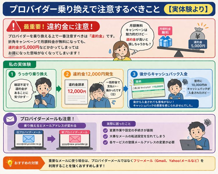 プロバイダーを乗り換える上で注意するべき事は「違約金」です。折角キャンペーンで月額料金が無料になっても、違約金が5,000円とかだったら意味ないですよね?!