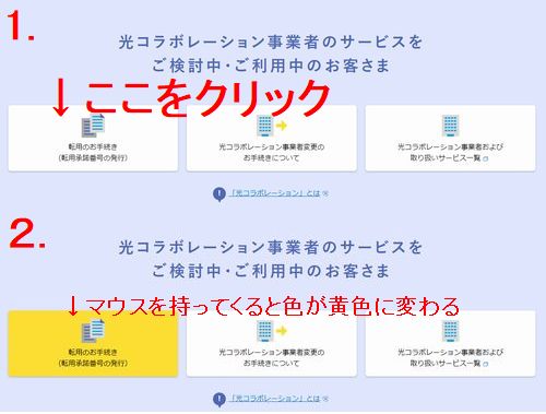 ホームページへアクセスすると、下の方へスクロールすると写真のような画像が見えてくるので、そこで止めて下さい。そして、右側にある【転用のお手続き】ってボタンをクリックします。写真のように、マウスをボタンに乗せると黄色になります。