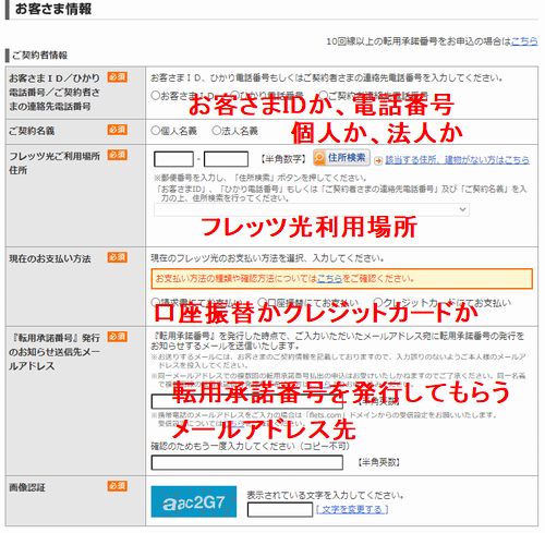 必要事項に自分の情報を記入します。1.【お客様ID】か【電話番号】か 2.【個人】か【法人】か 3.【フレッツ光利用場所】はどこか 4.【口座振替】か【クレジットカード】かお支払い方法について