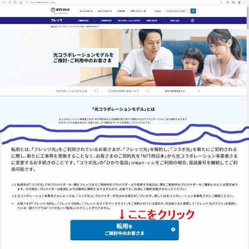 「光コラボレーションモデルについて」のページへ飛ぶので、下へスクロールします。【転用をご検討中のお客さま】という青いボタンが見えると思うので、そこをクリックして先に進めます。