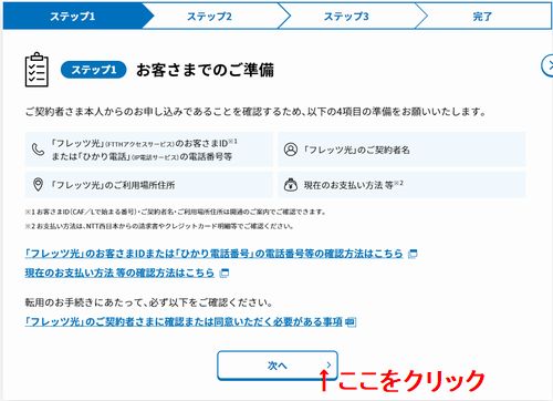 「お客様での準備」のページへ飛びます。まず準備をしましょう。【フレッツ光のお客様ID】か【ひかり電話の電話番号】、【フレッツ光の契約者名】、【フレッツ光の利用場所がわかる住所】、【現在のお支払い方法】などです。これらを準備しておきます。