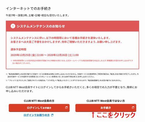 「インターネットでのお手続き」のページへ飛びますので、そこで「CLUB NTT-west会員」の方は会員ログインページへ。会員でない方は写真のように「CLUB NTT-westでない方 お手続き」の赤いボタンをクリックして先に進めます。