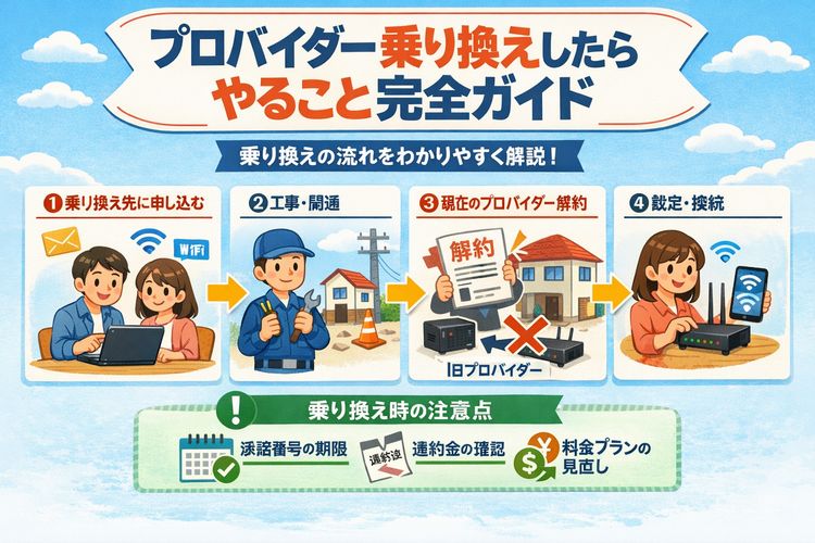 インターネットのプロバイダーを乗り換えるとき、何をどう進めれば良いか迷いますよね。この記事では、契約の基本的なステップから、事業者変更や転用・新規契約ごとの違いまで、やるべきことを順番にわかりやすく整理します。まずは全体の流れを抑えて、手続きの不安を解消しましょう。